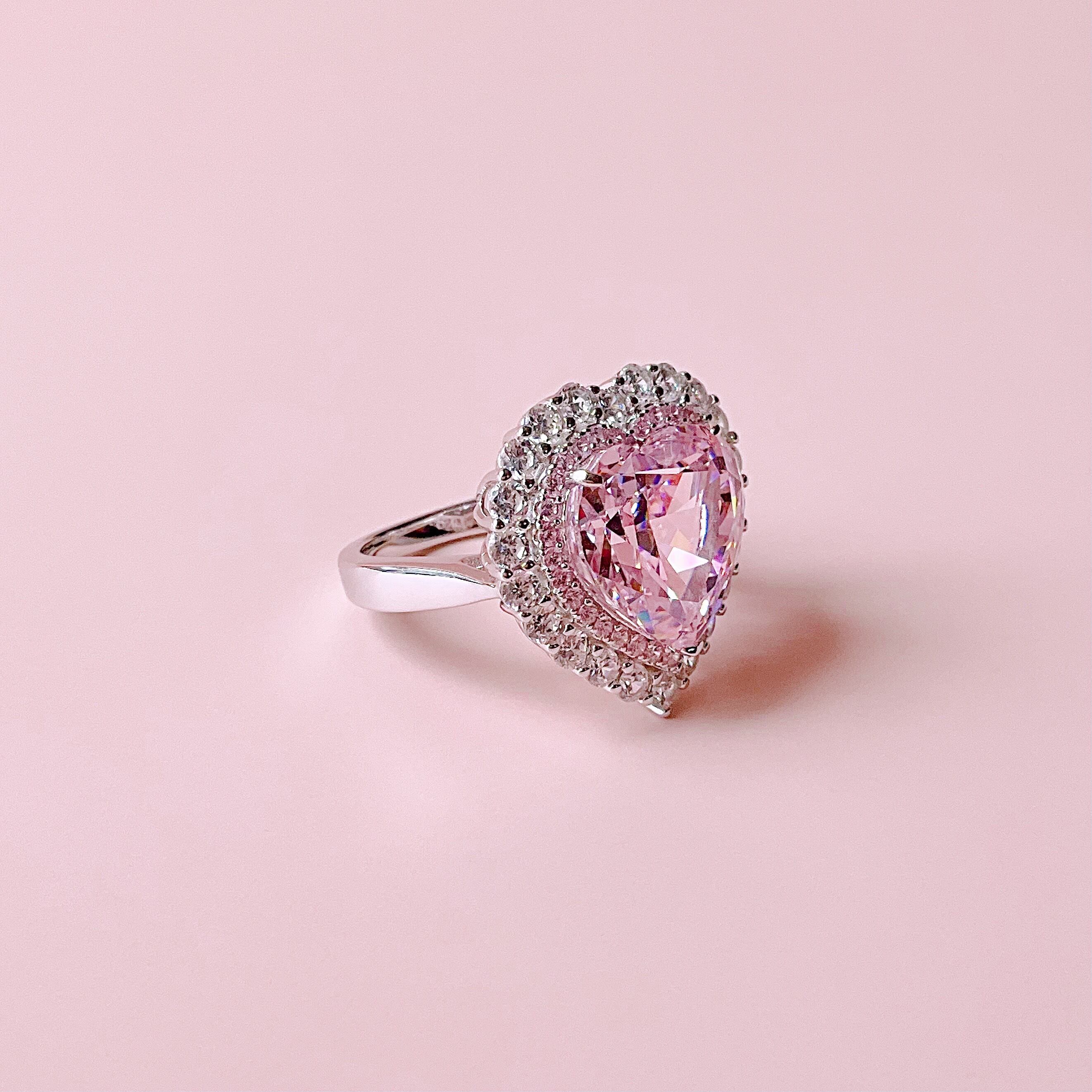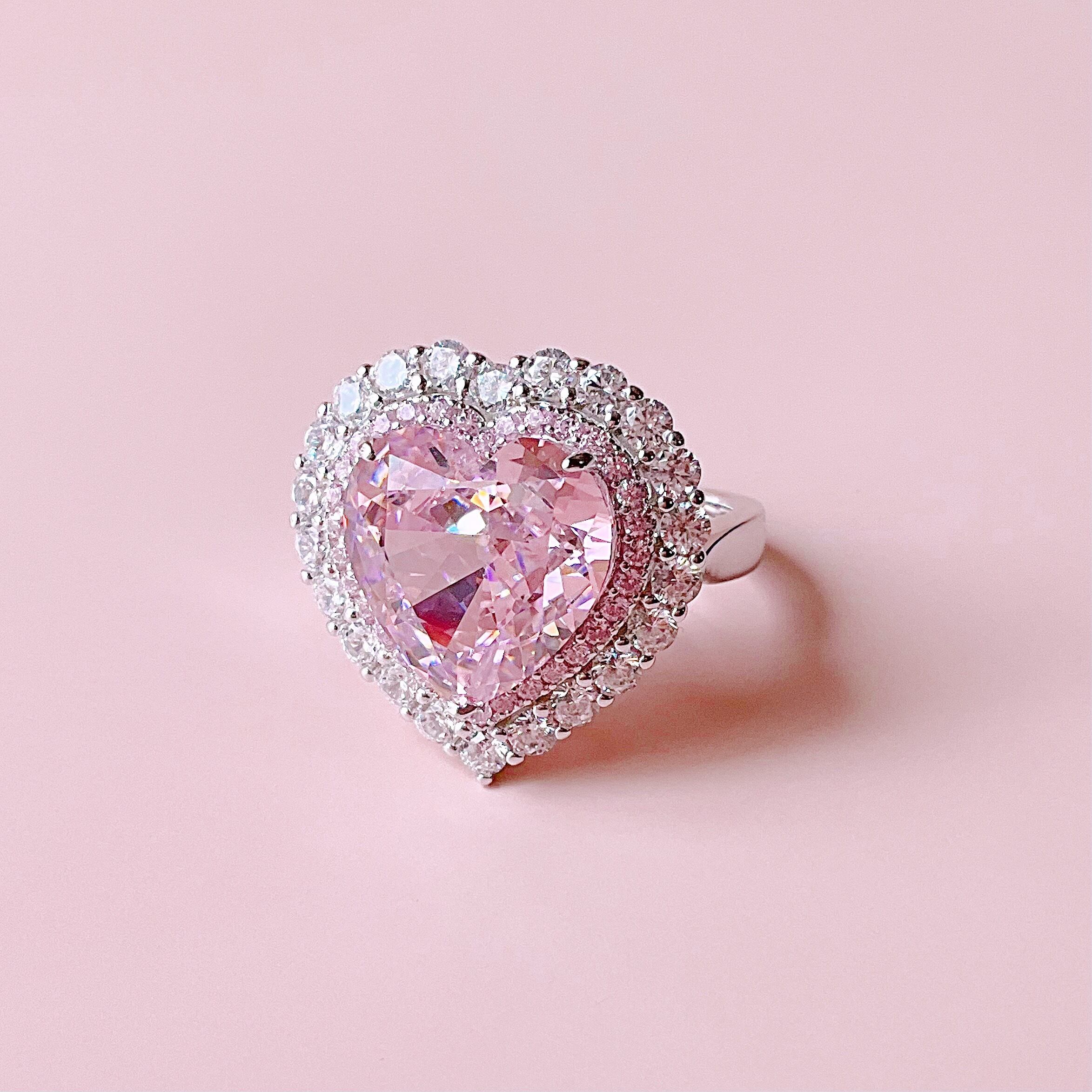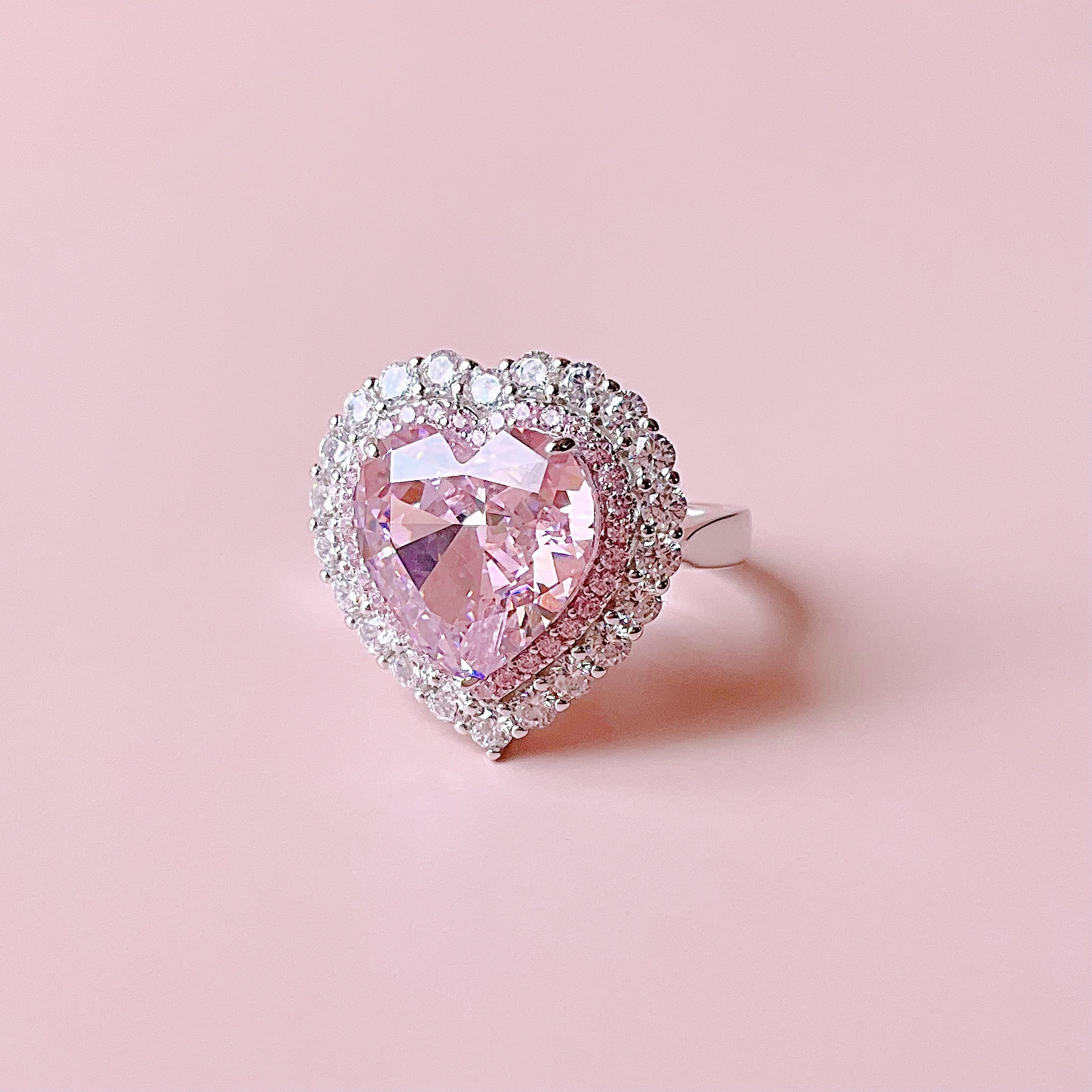ピンクのハートストーンを、星屑のように輝くハイカーボンダイヤモンドでぐるりと包み込み、やさしさや夢見る心を映すような、愛らしくも上品に♡♡