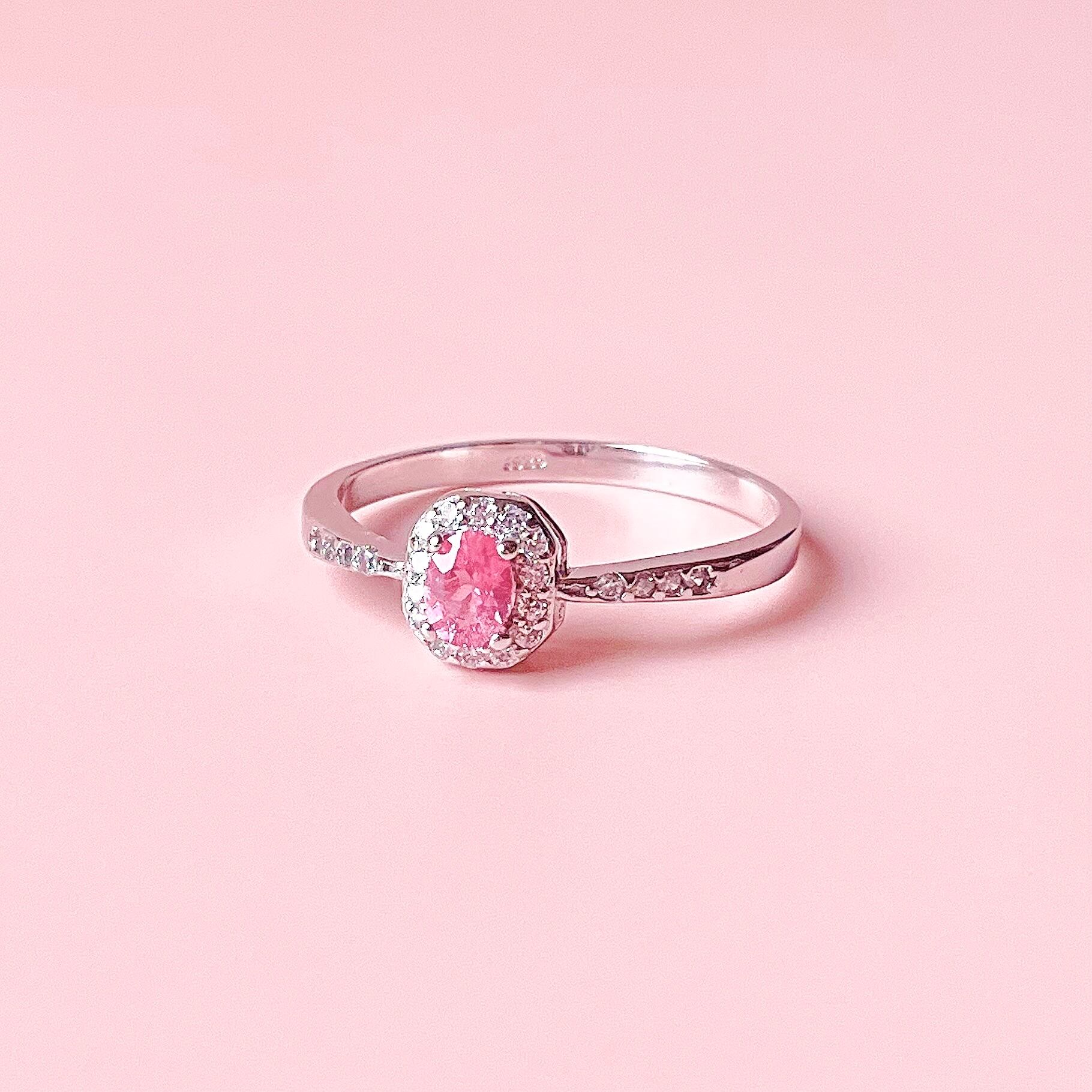 ピンクの鼻先をもつ白猫・バーミラからインスパイアした鮮やかなピンクサファイアが主役のリング「Burmilla pink」。