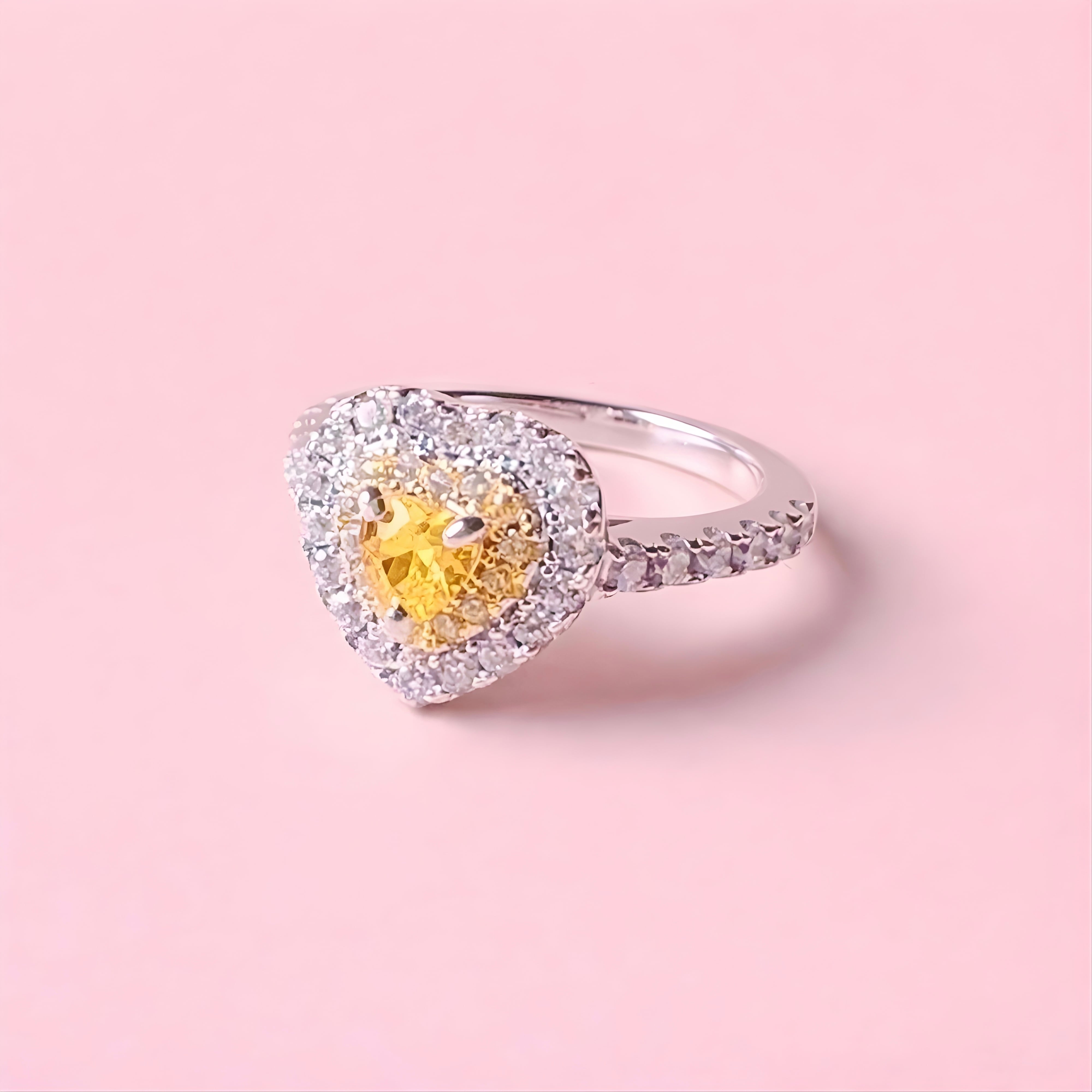 中央に輝くのは、ハートシェイプのラボグロウンサファイア。その澄んだイエローの輝きは、上品な大人可愛さを感じさせ、ひと目で心を奪われるような存在感を放ちます。周囲を囲む繊細なハイカーボンダイヤモンドが光を受けるたびに美しく反射し、指先に可憐で大人かわいい華やぎを添えてくれます♡