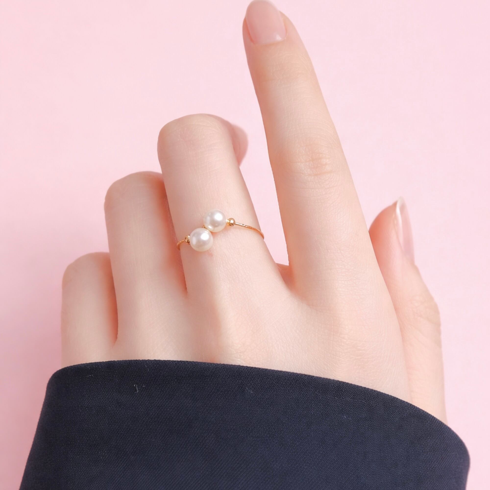 存在感のあるふた粒の天然パールが上品さもかわいさもさらにうわのせし、どんなシーンにも馴染んでくれるデザインなので、末長くご愛用して頂けるリングです。