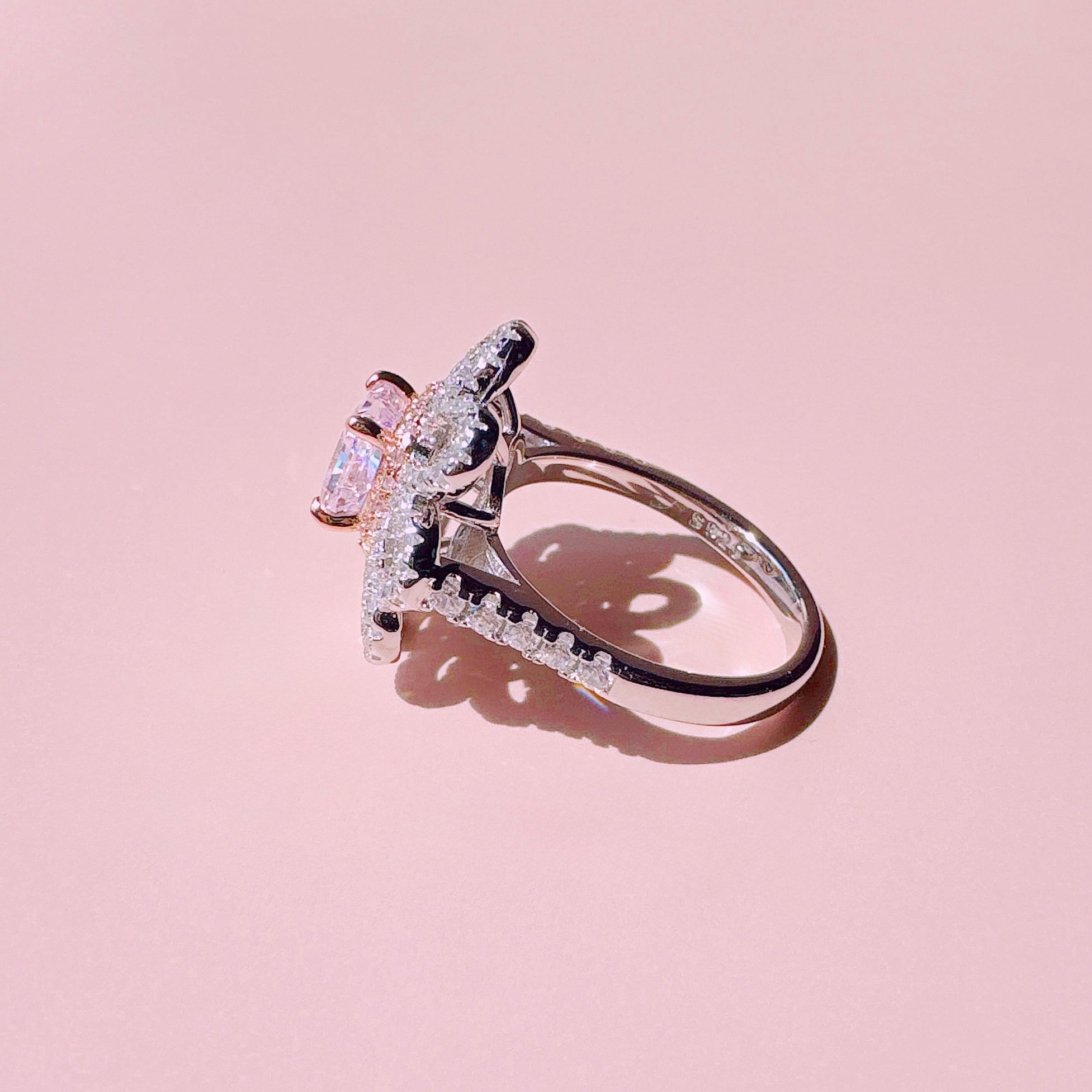 キラキラと輝くHigh carbon diamondsを花びらの形に合わせて使用し、メインストーンには淡いピンクサファイアを使用しています♡